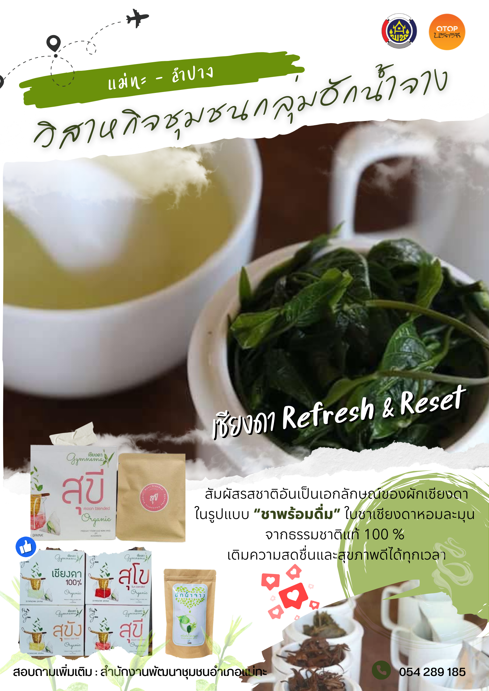 จากเกษตรกรสู่การร่วมตัวเป็นวิสาหกิจชุมชนกลุ่มฮักน้ำจาง แหล่งผลิตชาและเครื่องดิ่มใบเชียงดาออร์แกนิคคุณภาพสูง ปลูกด้วยวิถีอินทรีย์ ชนิดอบแห้งชงดื่มเพื่อสุขภาพ ผลิตโดยวิสาหกิจชุมชนฮักน้ำจาง ตำบลบ้านกิ่ว อำเภอแม่ทะ จังหวัดลำปาง