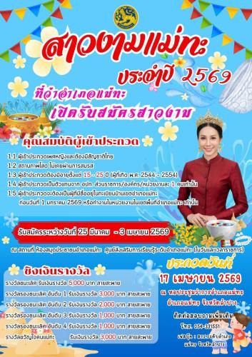 🔹️นายเกษม ใจจันทร์ นายอำเภอแม่ทะ มอบหมายให้ นางนัฏยา สมฤทธิ์ พัฒนาการอำเภอแม่ทะ เป็นประธานประชุมเตรียมความพร้อมกิจกรรมประกวดนางสาวแม่ทะ ปี 2569 พร้อมด้วย คณะทำงานกิจกรรมประกวดนางสาวแม่ทะ ปี 2569 และผู้แทนองค์กรปกครงส่วนท้องถิ่นอำเภอแม่ทะ เพื่อเตรียมความพร้อมร่วมงานสืบสานวัฒนธรรมประเพณีอันดีงามอำเภอแม่ทะ ในวันที่ 17 เมษายน 2569 ณ ห้องประชุมที่ว่าการอำเภอแม่ทะ ชั้น 2 อำเภอแม่ทะ จังหวัดลำปาง